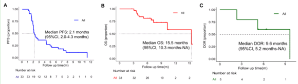 2020年7月12日,中位无进展生存为2.1月,中位总生存期为15.5月。5例达到客观缓解的患者中,中位反应持续时间为9.6月,2例患者仍在持续缓解中。