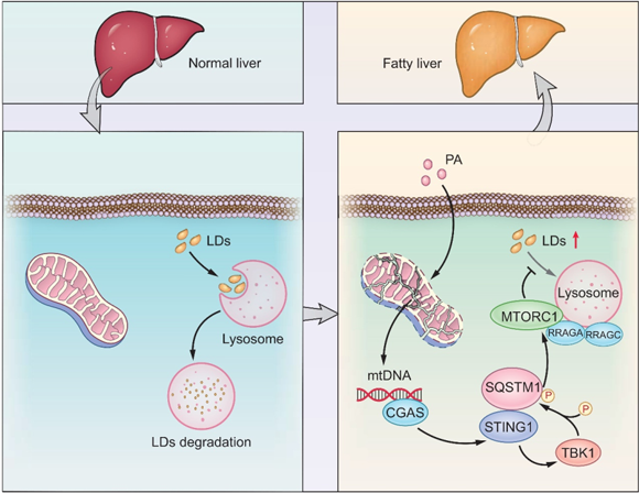 研究团队通过用棕榈酸处理细胞来模拟细胞内的脂毒性反应,发现棕榈酸处理细胞能够激活STING通路,进一步活化TBK1-P62信号轴来激活mTORC1酶活性,进而显著抑制细胞内的脂滴降解。敲除STING或者使用雷帕霉素抑制mTORC1酶活性均能够显著促进细胞内的脂滴通过溶酶体途径降解。同时,通过人脂肪肝的组织标本中也证实STING/mTORC1活化程度与肝内的炎症水平高度相关,与肝细胞内的脂滴数量呈现正相关。这些结果表明STING/mTORC1的活化不仅促进了肝内的炎症反应,也抑制了肝细胞内的脂滴降解,靶向STING/mTORC1可能作为一种抑制脂肪肝内的慢性炎症、减少肝细胞内脂肪酸积累的新途径。