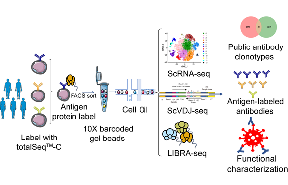 目前,全球已有超过1.6亿人确诊感染新型冠状病毒肺炎,超过340万死亡,严重危害全球公众健康。体液免疫应答抗是抵抗新冠病毒感染主力军之一,探究新冠病毒感染康复者体液免疫的应答机制,特别是新冠病毒特异的B细胞免疫应答情况,对新冠疫苗的设计以及相关治疗性抗体的研发具有重要意义。然而,目前对特异B细胞的免疫应答了解非常有限。
