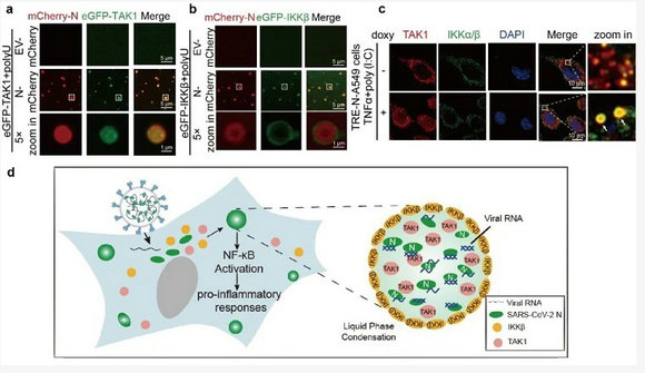 图:新冠病毒核衣壳(N)蛋白通过形成LLPS招募TAK1及IKKβ促进宿主NF-κB通路过度激活:a-b,纯化新冠病毒N蛋白、TAK1及IKKβ,体外重构相分离体系;c,细胞内新冠病毒N蛋白促进TAK1与IKKβ形成的“LLPS液滴”;d,新冠病毒N蛋白通过LLPS促进NF-κB通路机制示意图。