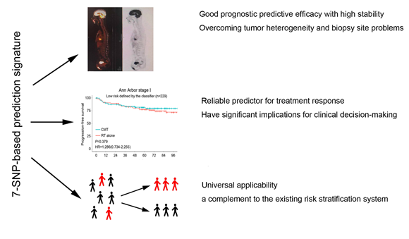 在这项国际回顾性多中心队列研究中,首先使用高通量SNP芯片鉴定出与生存相关的36个SNP位点。进一步采用LASSO回归模型构建了一个基于7个SNP的预测模型,可准确计算出个体化预后风险评分,该SNP预测模型在其他国内及国际队列中也具有较高的预后预测效能,且其预测效能不受肿瘤样本类型及肿瘤异质性影响,可作为当前IPI、KPI及PINK等预后系统的补充。在SNP预测模型基础上进一步结合年龄、Ann Anbor分期等临床指标构建的Nomogram评分系统可使预后预测效能进一步提高,对ENKTL患者个体化预后判断具有重要意义。不仅如此,SNP预测模型还可用于指导临床决策。在早期ENKTL患者中,SNP风险评分低危患者可接受单纯放疗,降低治疗成本并减轻治疗副反应;而SNP风险评分高危患者则建议接受放化疗综合治疗,降低复发风险。有助于规范个体化治疗标准,为实现ENKTL精准治疗提供有效新工具。
