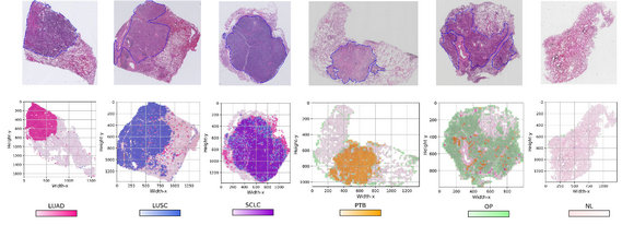 (上)从左到右分别为肺腺癌、肺鳞癌、小细胞肺癌、肺结核、机化性肺炎和正常肺部组织病理的可视化图像。