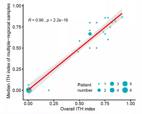 基于新算法计算的整体单次取样肿瘤内异质性在很大程度上可代表多点取样的 肿瘤内异质性,并且与患者多点取样肿瘤内异质性中位值高度相关,系数达 0.96,验证了 肿瘤内异质性分析从多点取样向单点取样的临床可行性。