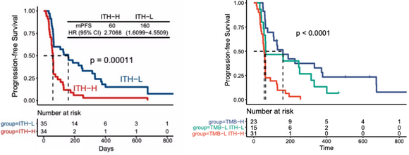 ITH-L的患者具有更长的生存期。此外,肿瘤内异质性 分布与TMB并无相关性,可认为是两个互相独立的指标。当联合TMB后,肿瘤内异质性能够在TMB-L的患者中进一步区分出疗效好和疗效差的两组。