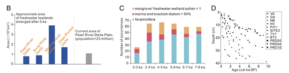 主要三角洲和海岸平原的演变。(A) 研究区域主要三角洲平原。A1,珠江三角洲;A2,红河三角洲;A3, 湄公河三角洲;A4,湄南河三角洲;A5,福州盆地;A6,汉江三角洲(上)、涟河三角洲(下);A7,海丰平原;A8,宋卡-帕塔龙平原。灰色虚线显示为距今6-5 ka海岸线的位置。(B)该区域大型三角洲在5 ka以后出陆的平原面积估算。(C)沉积记录揭示的3-2 ka沉积环境的变化。(D)沉积物年龄-深度曲线显示三角洲沉积速率的变化 (马婷供图)