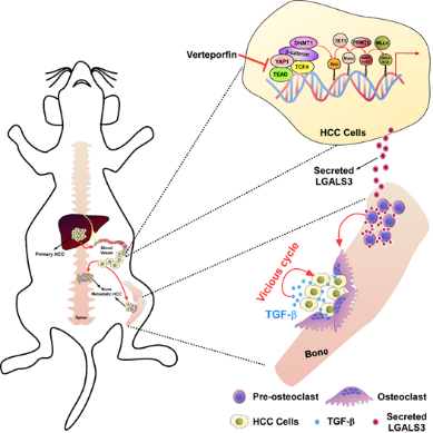 综上所述,这项研究提供了从多个方面的证据以证明肝癌细胞分泌的LGALS3具有促进肝癌骨转移的生物学功能。并证明采用维替泊芬处理可通过降低LGALS3的表达而有效地抑制了肝癌骨转移的效果。这些发现不仅增添了骨转移前微环境形成机制,而且为预防、诊断和治疗肝癌骨转移提供新的理论依据及潜在治疗策略。