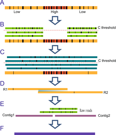 三代测序技术(PacBio和Oxford Nanopore)可解决基因组重复区域的组装难题,提高基因组完整性,已成为发育、再生、肿瘤和其它疾病过程中细胞基因组组装的主流技术。其中,纳米孔(Nanopore)测序技术的迅速发展更使得测序成本显著降低,并且由于其可实现超长读长(高达1Mbp),在复杂基因组组装中具有天然优势。然而,目前Nanopore的测序错误分布广泛(10-30%,图1A),存在高错误局部区域(1000bp中存在50%测序错误,图1B),并且高错误局部区域的发生随着测序读长增加而显著增加(图1C),从而导致超长文库数据中20-30%的序列存在高错误区域。现有的错误校正软件只能通过裁剪的方式剔除高错误局部区域,显著降低了Nanopore序列完整性和组装完整性。