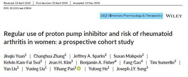 除糖尿病外,研究小组还关注PPIs与类风湿关节炎发生风险,通过类似研究方法发现PPIs升高约44%类风湿关节炎风险。该论文发表于消化及药学领域经典杂志Aliment Pharmacol Ther (IF: 7.515)。
