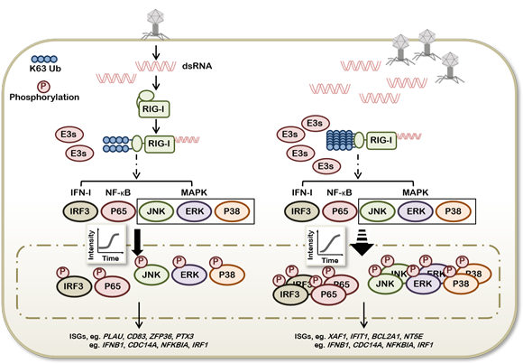 图1,RIG-I锚定泛素修饰的多层次结合模型为下游基因特异性转录提供调控手段