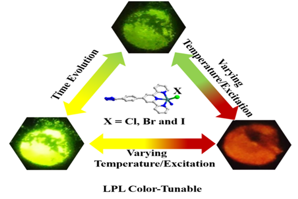 长余辉(LPL) 材料由于其在关闭激发光源后仍延续一段时间的三线态磷光发射特性,在成像、防伪、照明、显示和磷光激光等领域展现了巨大的应用前景。在过去的几十年,无机氧化物、碳量子点、钙钛矿、高分子聚合物、有机小分子以及金属-有机配合物等不同类型的长余辉材料已被设计、合成和推广。但是这些材料基本上都表现为单一颜色的长余辉发光。换言之,它们的辐射跃迁主要来自于同一来源的分子激发三线态T1。而来自于不同分子激发态,并能够随激发波长、时间、温度等参量产生多模调色特性的长余辉发光材料仍有待开发。