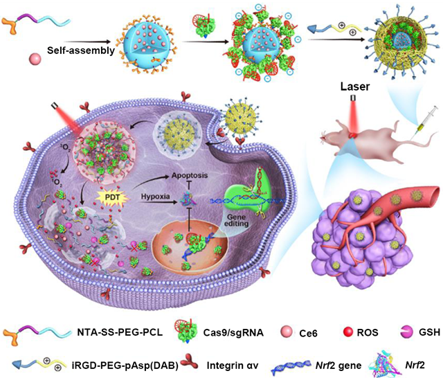 针对上述难题,程度副教授团队开发了一种还原敏感的多功能载体材料(如上图),载体的疏水性嵌段包载抗肿瘤光动力药物Ce6,携带NTA基团的嵌段则通过NTA和Cas9蛋白末端His标签之间的特异性结合高效负载Cas9蛋白/sgRNA复合物,然后通过静电组装在外层引入靶向肿瘤组织的iRGD分子。这样的载体结构设计和药物联合输送为实现肿瘤组织特异性的基因编辑和联合治疗提供了可行性。纳米药物靶向输送至肿瘤细胞后,在近红外光的辐照下,Ce6产生的活性氧使溶酶体破裂,使纳米药物从溶酶体中逃逸出来,NTA和载体聚合物之间的二硫键可响应胞质内的谷胱甘肽等还原剂而断裂,从而将Cas9蛋白/sgRNA复合物从载体上释放出来,执行基因编辑功能。在正常的组织中,由于没有近红外光的辐照,Cas9蛋白/sgRNA复合物难以从溶酶体中逃逸,无法执行基因编辑的功能。通过红外光辐照和还原敏感设计实现了肿瘤组织特异的基因编辑。此外,肿瘤细胞在受到Ce6所生成活性氧攻击时,会上调Nrf2(一种活性氧代谢的关键蛋白)的表达,提高肿瘤细胞对活性氧的耐受性。使用靶向Nrf2基因的sgRNA,可以通过联合输送的Cas9蛋白/sgRNA复合物使Nrf2基因失活,提高肿瘤细胞对活性氧的敏感性。总而言之,通过多功能载体联合输送Ce6和Cas9蛋白/sgRNA复合物,一方面实现了肿瘤特异性的基因编辑,另一方面也实现了基因编辑和光动力治疗的联合治疗,协同提高了基因编辑的特异性和治疗效果,为基因编辑技术的发展提供了一个新的方向。