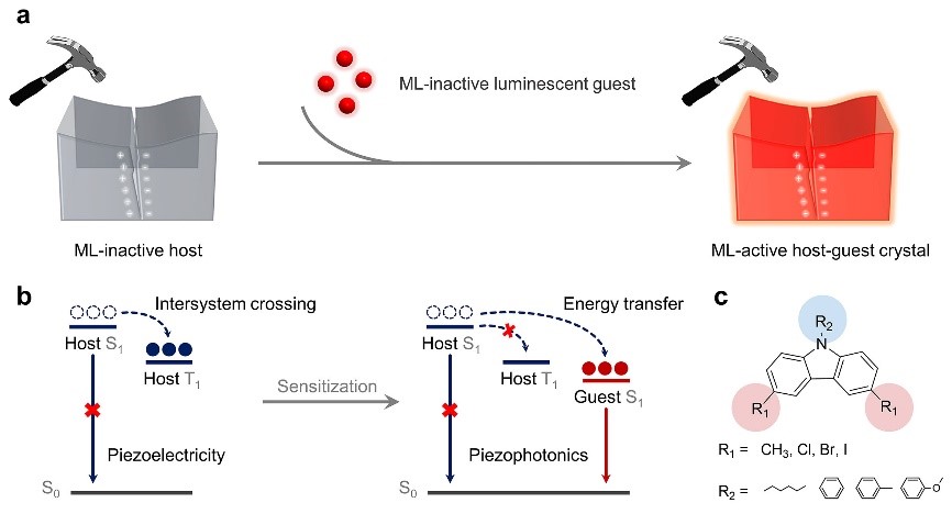 近日,开云下注(中国)官网化学学院池振国教授研究团队提出利用一种更加简单的方法来精准设计力致发光复合材料体系的新设计策略。该策略设计的力致发光复合材料体系中,单独的主体材料和客体材料都不具有力致发光性能,但是通过主客体复合得到的复合体系则具有力致发光性能,实现了从无到有的力致发光。同时,客体材料的选择范围非常广,可以是纯有机发光材料、配合物磷光材料,也可以是无机量子点发光材料等等。通过改变客体材料的种类,非常容易调节力致发光的发光颜色、亮度、色纯度以及发光寿命等性能,极大地丰富了力致发光材料的研究内涵。结合光物理测试和理论计算,深入探究这类新型力致发光复合体系的激发过程和发射过程,并揭示了复合体系力致发光的激活机制是源于压电效应和主客体分子的能量转移。