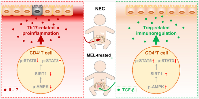 通过进一步研究发现,MEL防御Th17/Treg细胞失衡与活化AMPK/SIRT1信号通路有关。本研究不但为NEC的防御提供新的策略,更为其靶向治疗提供了新的思路。