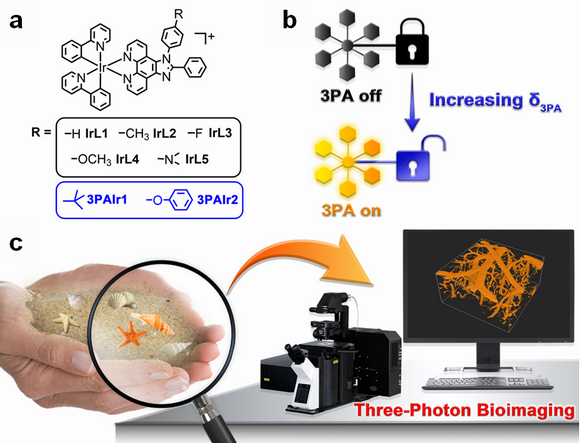 我校化学学院巢晖教授课题组、沈勇副教授课题组和我校附属第一医院裴中教授课题组通过合作研究,于近期发展了一种理论计算与实验测试相结合的三光子荧光染料有效筛选方法,设计、合成了一类具有三光子磷光的新型铱(III) 配合物,并成功将其用于生物荧光成像研究。在研究中,他们发现不改变配合物母体结构,仅通过引入一些特殊的官能团修饰,能有效地将配合物的三光子跃迁几率和量子产率提升近四倍,极大地改善了铱(III)配合物的三光子光物理性质。