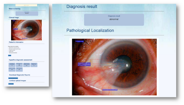 与传统图片级分类标注方法相比,Visionome技术可多产生12倍标签,而这些标签训练出来的算法显示了更好的诊断性能。基于此技术,团队训练出可准确识别多种眼前段病变的裂隙灯图像智能评估系统,可应用于大规模筛查、综合分诊、专家级评估、多路径诊疗建议等多个临床场景。不仅在回顾性数据集中表现出眼科专家级别的诊断水平,在前瞻性数据集中也表现出色。使用者通过在Visionome诊断系统中上传眼前段图像,即能一次获得多个部位的全方位诊断,与传统的人工智能算法相比,Visionome系统可生成更加全面、精细、具体的报告,真正让医学人工智能应用揭开神秘的面纱,成为一个接地气的“医生”。
