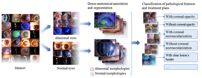我校中山眼科中心林浩添教授、刘奕志教授与西安电子科技大学刘西洋教授带领团队经过5年钻研合作,首创了一种基于解剖学和病理学特征对医学图像进行密集标注的方法——医学图像密集标注技术Visionome。最新研究成果“Dense anatomical annotation of slit-lamp images improves the performance of deep learning for the diagnosis of ophthalmic disorders”于2020年6月22日发表于《自然》杂志的子刊《自然生物医学工程》(Nature Biomedical Engineering,IF=17.135),并进入临床转化应用。