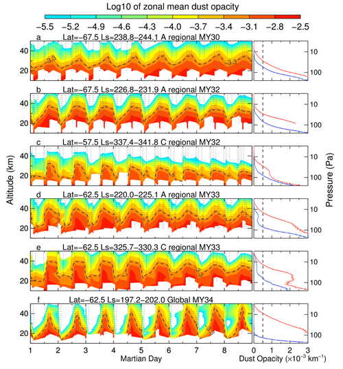 图1. 火星大型沙尘暴期间剧烈的沙尘周日变化