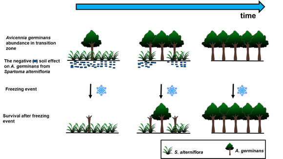 近日,国际生态学知名期刊Journal of Ecology(生态学一区,IF5年= 6.817)发表了我校生命科学学院彭少麟教授团队与美国佐治亚大学James E. Byers教授团队合作完成的最新科研成果“Freeze-tolerance of poleward-spreading mangrove species weakened by soil properties of resident salt marsh competitor”。该研究发现北美东海岸黑红树(Avicennia germinans)向高纬度扩张入侵本地互花米草(Spartina alterniflora)群落,从全新的视角揭示了全球变化背景下植物向高纬度扩张的新机制。