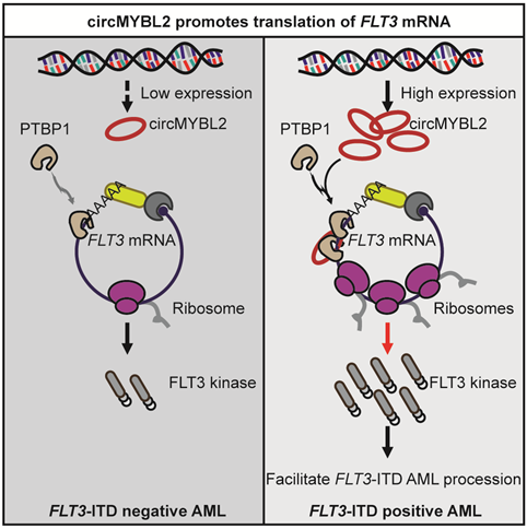 该论文阐明了环状RNA(circular RNA, circRNA)circMYBL2通过招募RNA结合蛋白PTBP1调控癌基因FLT3 mRNA的翻译效率,从而促进了FLT3-ITD突变型白血的发生发展。该项研究成果首次报道新型非编码RNA circRNA以RNA-蛋白复合体形式发挥对翻译进程的正调控作用,揭示了环状RNA的新功能。