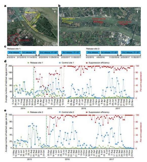 释放HC雄蚊的现场试验点 ,时间和蚊幼虫压制效果