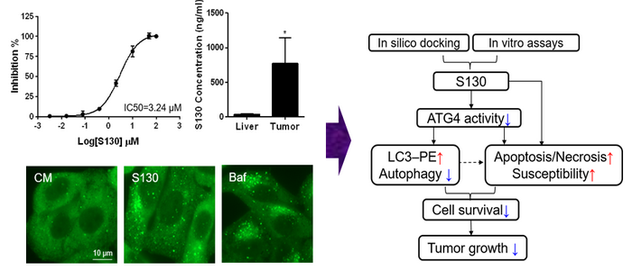该文章以自噬关键蛋白ATG4B为靶点,通过计算机虚拟筛选和建立荧光共振能量转移的体外高通量筛选体系,筛选得到新型的ATG4B小分子抑制剂S130。通过对自噬信号通路的研究,发现S130不影响自噬体功能及其与溶酶体的融合,而是抑制了LC3-PE的去脂化过程,最终阻断细胞自噬。这为进一步明确ATG4B在自噬信号通路中的调控作用提供了新的理论基础。通过抗肿瘤作用的研究,发现S130可有效抑制结肠癌细胞的生长,且营养缺乏能进一步增强S130的抗肿瘤效果,而过表达ATG4B可部分对抗S130引起的肿瘤细胞死亡,提示ATG4B可能是肿瘤治疗中的潜在靶点。同时,药代动力学实验结果表明,该抑制剂在体内主要分布于肿瘤组织,从而抑制结肠癌细胞的生长。综上,该研究表明ATG4B可能是肿瘤治疗的潜在药物靶标,而S130作为高效的ATG4B小分子抑制剂具有开发成为肿瘤治疗药物的潜能。