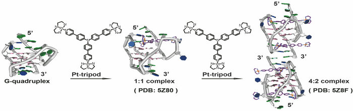 我校化学学院毛宗万教授研究团队设计合成了一个具有光敏性的三苯胺桥联的三脚架型铂配合物Pt-tripod,在体外和体内都表现出高潜力的DNA靶向光动力治疗抗肿瘤效果。机制研究表明,通过光照,Pt-tripod可以诱导细胞产生ROS并快速损伤DNA,也包括G-四链体DNA(Chem. Eur. J, 2017, 23: 16442–16446.)。在前期研究的基础之上,毛宗万教授研究团队在铂配合物Pt-tripod与G-四链体的NMR结构解析上取得了突破性进展。实验研究发现,Pt-tripod能特异性靶向混合I型人体端粒G-四链体DNA,并能显著抑制端粒酶的活性。利用NMR方法深入探索了Pt-tripod与人体端粒G-四链体DNA序列Tel26的动态结合。NMR实验表明,Pt-tripod可以逐渐诱导人体端粒G-四链体Tel26形成多个“Pt-tripod-Tel26”复合物,包括单体、二聚和多聚G-四链体与Pt-tripod的复合物。研究团队确定了其中两个复合物的NMR结构,分别是1:1和4:2 Pt-tripod-Tel26复合物结构。铂配合物与G-四链体复合物的结构信息为设计合成特异性靶向混合型人体端粒G-四链体的铂合物提供了结构基础,同时对研究G-四链体DNA与小分子的动态结合以及小分子诱导多聚体G-四链体高级结构的形成具有指导性意义。