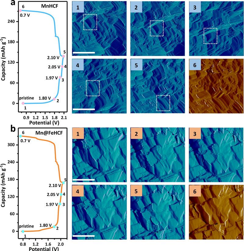 有别于传统单金属活性中心普鲁士蓝材料外延层,具有双金属活性中心的FeHCF能够在不损失复合材料比容量的前提下,实现对核心MnHCF姜泰勒畸变的有效抑制。该复合材料在100 mA g–1的电流密度下,输出高达166 mA h g–1的可逆比容量,已接近该类材料的理论值(~170 mA h g–1),且经过400圈仍可维持72.4%的比容量。通过系统表征材料在充放电过程中离子的嵌脱机理和晶格变化,结果表明作为壳层的FeHCF的晶格变形程度远小于核心MnHCF。结合拉曼光谱和穆斯堡尔谱分析研究发现,锌离子的嵌入会引起FeHCF的原位表面非晶化,最终形成由非晶/晶体FeHCF包覆MnHCF的“核-双壳”结构复合材料。非晶材料具有无定形结构,通常具有较好的韧性、强度和耐腐蚀性。因此,由非晶和低应变晶体构建的双重壳层结构对核心材料起到了很好地保护作用,大幅提升了电池的循环稳定性能。此外,该团队首次利用原位电化学原子力显微镜实时观察电池反应中电极的表面形貌变化(见图2),结果表明“核壳”结构复合材料具有更小的体积形变,进一步验证材料结构设计的合理性。