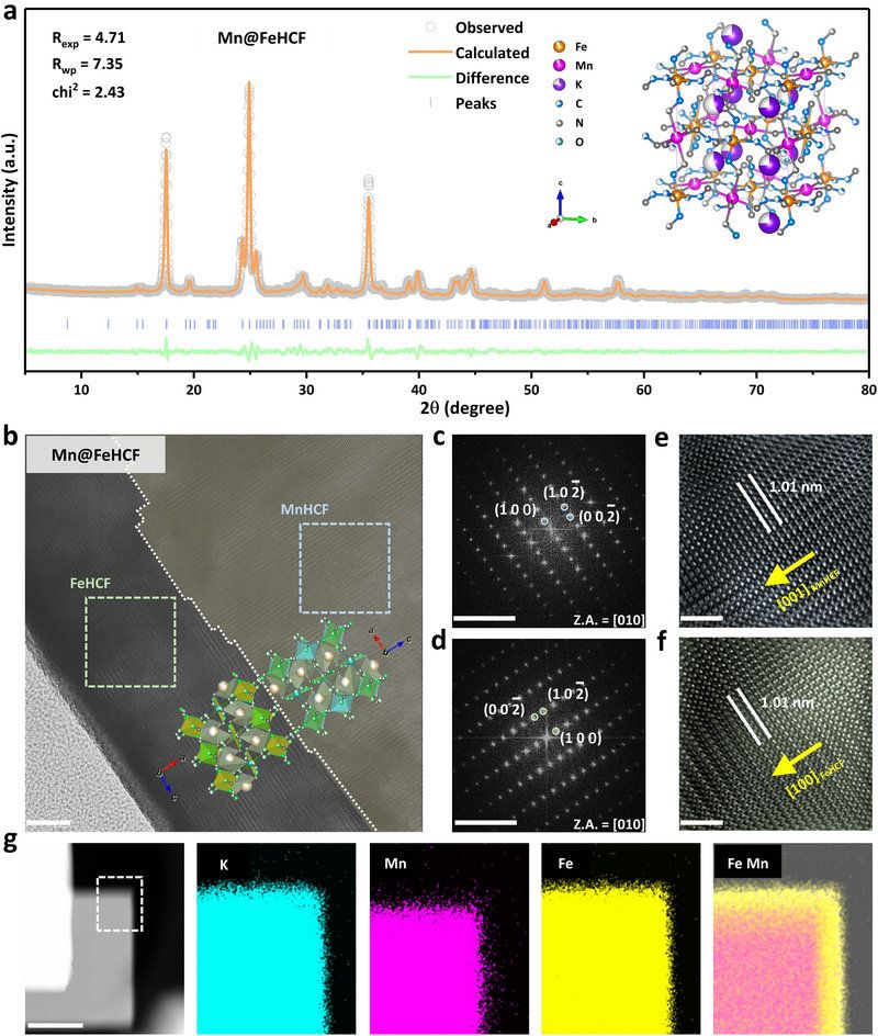 近日,该研究团队利用溶液法在锰基普鲁士蓝(MnHCF)表面首次成功地实现了铁基普鲁士蓝(FeHCF)的异质外延生长,从而制备出具有独特“核壳”结构的多金属活性中心普鲁士蓝复合材料(Mn@FeHCF)。MnHCF和FeHCF的晶体结构高度相似,都属于单斜晶系,晶格参数差异极小,这为外延生长提供了良好的基础条件。然而FeHCF的Ksp值远低于MnHCF,导致在溶液中FeHCF的成核速率要远高于MnHCF。因此,如何开发新型的合成策略来有效降低FeHCF的成核速率对于实现外延生长非常关键。该团队首次提出采用亚铁氰根离子代替传统的二价铁离子作为铁源,利用其在特定酸性环境下的缓慢自分解,成功合成出外延“核壳”复合材料,见图1。