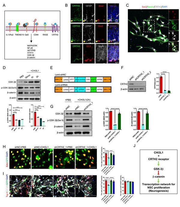 CHI3L1/CRTH2通过抑制β-catenin信号通路抑制NSCs增殖和分化:通过免疫荧光共标记发现,仅CRTH2在神经干细胞中表达。并发现CHI3L1蛋白刺激NSCs可以明显抑制β-catenin的表达,而利用表达shRNA的慢病毒敲除NSCs中CRTH2后,β-catenin的表达得到了明显恢复;同时发现,敲降CRTH2受体能够挽救CHI3L1对神经干细胞增殖分化的抑制作用。因此,调控CHI3L1/CRTH2/β-catenin信号通路可以改善NMOSD小鼠模型中神经干细胞增殖分化缺陷(图5)。