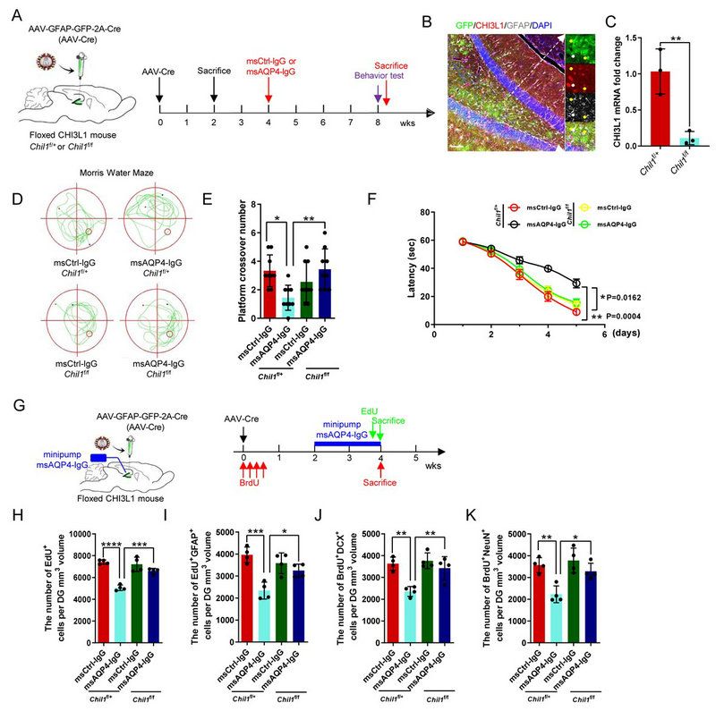 特异性敲除星形胶质细胞中CHI3L1,可改善NMOSD模型小鼠海马神经发生缺陷及认知功能障碍:本研究进一步应用Chil1flox/flox小鼠,特异性敲除星形胶质细胞中CHI3L1,能够挽救NMOSD动物模型的海马神经发生缺陷及认知功能障碍(图4)。