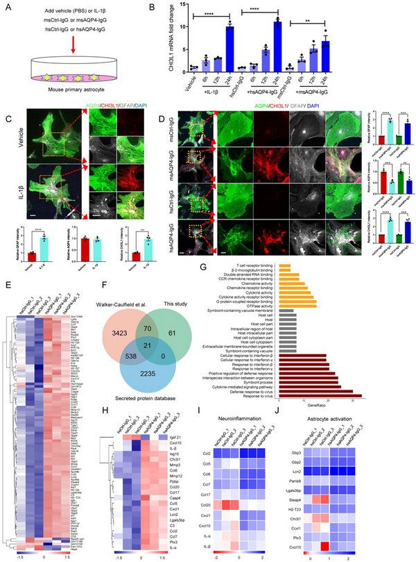 AQP4-IgG刺激星形胶质细胞释放多种炎症因子:该研究首先利用RT-qPCR验证了AQP4抗体(AQP4-IgG)可以诱导星形胶质细胞增加CHI3L1的表达。通过免疫荧光染色,进一步阐明了AQP4抗体可激活星形胶质细胞CHI3L1的表达,并导致AQP4表达降低及内化。转录组测序分析发现,AQP4-IgG刺激星形胶质细胞分泌大量的炎症因子(包括CHI3L1)(图1)。