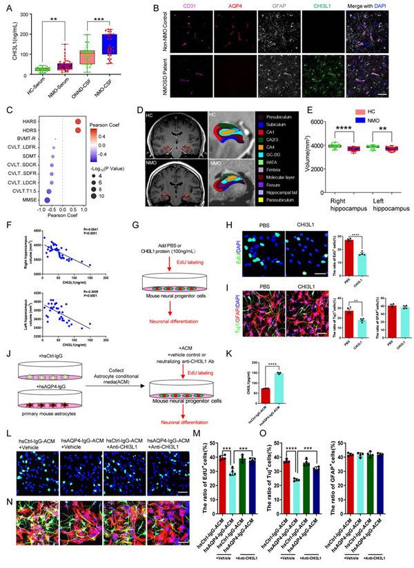 CHI3L1水平与海马认知功能相关性分析: 该研究还对NMOSD患者血清、脑脊液及脑活检病理切片进行了分析,证实NMOSD患者中CHI3L1水平明显升高;通过对海马影像学及相关认知功能评分分析,发现NMOSD患者认知功能下降可能与海马体积改变有关,左、右海马体积与血清中CHI3L1含量成一定负相关;经CHI3L1蛋白刺激后,神经干细胞(NSCs)的增殖和分化被显著抑制;而预先在AQP4-IgG刺激后的星形胶质细胞的条件培养基中加入CHI3L1中和抗体去除CHI3L1,则能够明显改善神经干细胞增殖和分化(图2)。