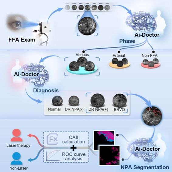 人工智能技术在医学应用最大的作用是使优质医疗资源扩容下沉、拓展专家经验,辅助年轻医生在医疗资源不足的地区也能开展高质量的医疗活动,让广大人民群众享受到均质化的优质医疗服务。荧光素眼底血管造影(fundus fluorescein angiography, FFA)检查是诊断和评估缺血性视网膜等眼底疾病的金标准,但FFA图像的解读是眼科难度最大的检查之一,这使得FFA检查仅能在有丰富临床经验的眼底专科医生的医疗机构开展。为此,研究团队瞄准这一最需要人工智能技术辅助的方向,研发了FFA图像解读及缺血性眼底疾病智能诊疗的系统Ai-Doctor,让这个金标准检查在眼底专科医师紧缺的医疗机构也可以开展,减少缺血性视网膜疾病的漏诊并提升治疗的精准性。