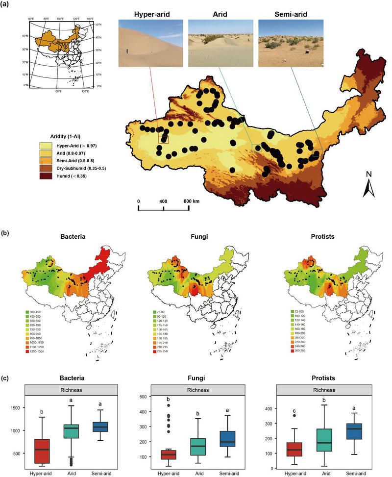 开云下注(中国)官网生命科学学院李文均课题组董雷等人前期在我国西北荒漠主要分布区,包括八大沙漠(塔克拉玛干沙漠、古尔班通古特沙漠、库姆塔格沙漠、柴达木盆地沙漠、巴丹吉林沙漠、腾格里沙漠、乌兰布和沙漠、库布齐沙漠)及其周边区域进行了大规模的野外样品采集工作(图1a),测定了其生物及非生物参数指标,并利用高通量测序技术获取不同微生物类群(细菌、真菌、原生生物)的序列信息。通过耦合气候、地理、理化参数和物种组成等信息,以探寻不同干旱程度的荒漠生态系统(极端干旱荒漠、干旱荒漠、半干旱荒漠)中各微生物类群的地理分布特征,响应规律及驱动其群落构建的内在、外在因素。