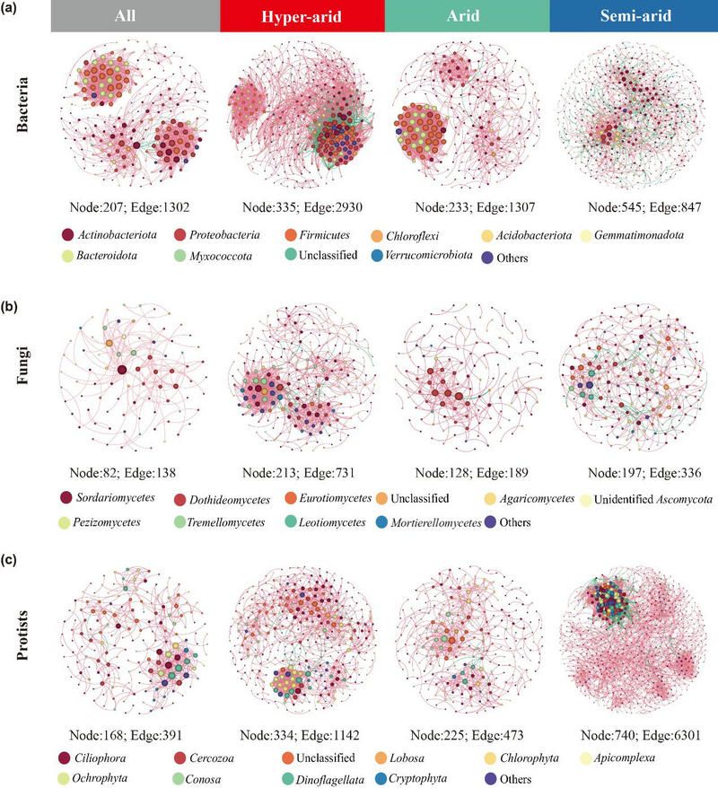 图3. 不同荒漠生态系统中各微生物群落的共现关系网络