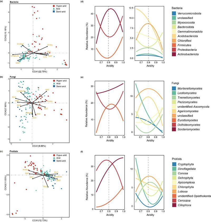 进一步利用典范对应分析法(CCA)比较不同沙漠生态系统下细菌、真菌和原生生物的多样性与环境异质性/土壤理化性质的关系。细菌和原生生物具有类似的分布格局,即在半干旱和干旱荒漠中相对聚集,并与极端干旱荒漠明显区分开来。真菌则在不同荒漠中均有较大的差异(图2)。有趣的是,通过耦合主要类群相对丰度与干旱度数值的相关性,我们研究发现区分极端干旱和干旱生态系统的阈值0.8也是大多类群相对丰度变化的拐点值。某些真菌(如粪壳菌纲)和原生生物(纤毛亚门)的丰度则随着干旱程度的增加而升高(图2),表明这些微生物可能具有耐受极端干旱环境压力的能力。
