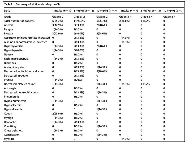 在安全性方面,信迪利单抗耐受性表现良好,29名患者中有89.7%患者至少出现一种治疗相关不良事件。包括贫血(34.5%)、疲劳(6.9%)、甲状腺功能减退(17.2%)、甲状腺功能亢进(13.8%)等。10.3%出现了Grade 3的治疗相关不良反应,包括转移酶升高和肌炎,以及血小板计数降低。安全数据没有显示出剂量(1-10 mg/kg)相关的特征。