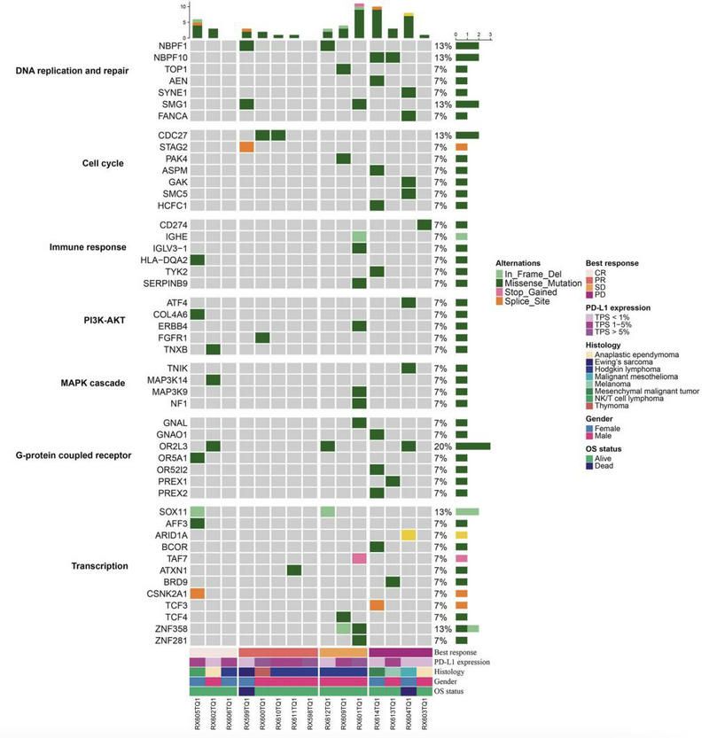 另外,研究还对患儿的肿瘤标本进行测序,结果发现G蛋白偶联受体 (GPCR)作为参与信号传递的最大的细胞膜相关分子基因家族,与治疗抵抗和免疫逃避有关,患儿对免疫检查点抑制剂的响应率低,可能与 GPCR 通路激活有关。