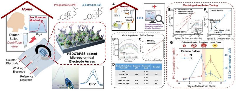 近期,开云下注(中国)官网材料科学与工程学院谢庄副教授课题组提出了一种三维微结构柔性电极策略,实现了低成本亚飞摩级的性激素电化学免疫传感。该传感器能够直接检测高度稀释的唾液样本中的激素,无需使用离心等仪器,从而便于在家中进行唾液测试和监测整个女性月经周期中的唾液P4和E2。传感器的核心是基于在微金字塔阵列涂覆掺杂三氟甲烷磺酰胺锂(LiTFSI)的聚(3,4-亚乙基二氧噻吩):聚(4-苯乙烯磺酸盐)(PEDOT:PSS)的导电高分子电极及结合金纳米粒子(AuNPs)以促进激素抗体的固定。这种简单的免疫传感工作电极通过微针尖促进分子扩散富集,可以在几分钟内经由微分脉冲伏安法(DPV)的峰值电流下降,实现P4和E2在亚fM到μM水平的高灵敏宽范围电化学检测。
