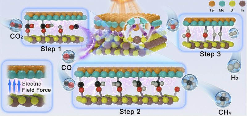 图1. Sv-In2S3@2H-MoTe2(5)中Mo−S键耦合调节CO2RR的示意图