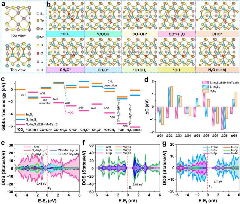 图2. (a) Sv-In2S3@2H-MoTe2(5)的原子模型;(b) Sv-In2S3@2H-MoTe2(5)界面上CO2RR过程中吸附原子结构示意图;(c) Sv-In2S3@2H-MoTe2(5)、Sv-In2S3和In2S3在1.23 V电压下不同活性位点上CO2RR的吉布斯能和(c)能量变化;(e) Sv-In2S3@2H-MoTe2(5)、(f) 2H-MoTe2和(g) Sv-In2S3的态密度。