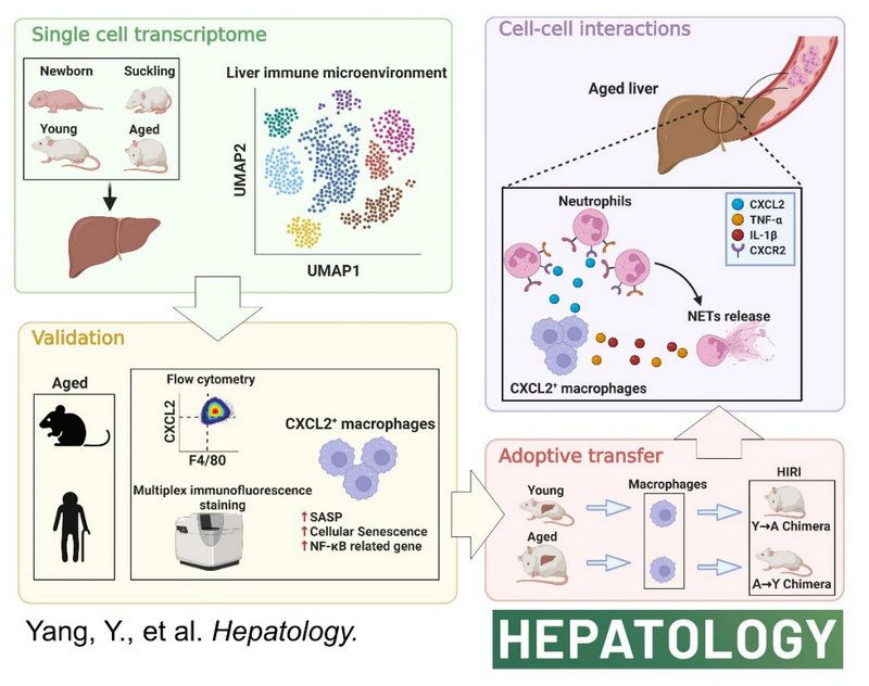 开云下注(中国)官网网讯(通讯员叶林森)近日,开云下注(中国)官网附属第三医院肝脏外科杨扬教授团队在肝脏病学顶级期刊Hepatology在线发表题为“Single-cell immune profiling of mouse liver aging reveals Cxcl2+ macrophages recruit neutrophils to aggravate liver injury”的研究论文。深入探讨了Cxcl2+巨噬细胞通过CXCL2-CXCR2轴驱动的中性粒细胞募集机制,并提供了潜在的治疗策略,以应对与年龄相关的肝损伤。论文的共同通讯作者为开云下注(中国)官网附属第三医院肝脏外科杨扬教授、张英才教授、郑俊主治医师以及开云下注(中国)官网中山医学院杨建荣教授。