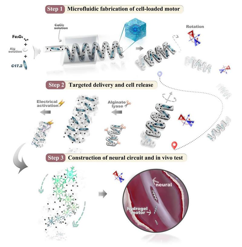 图1 负载神经干细胞的螺旋水凝胶微马达的制备及其应用于神经再生的示意图