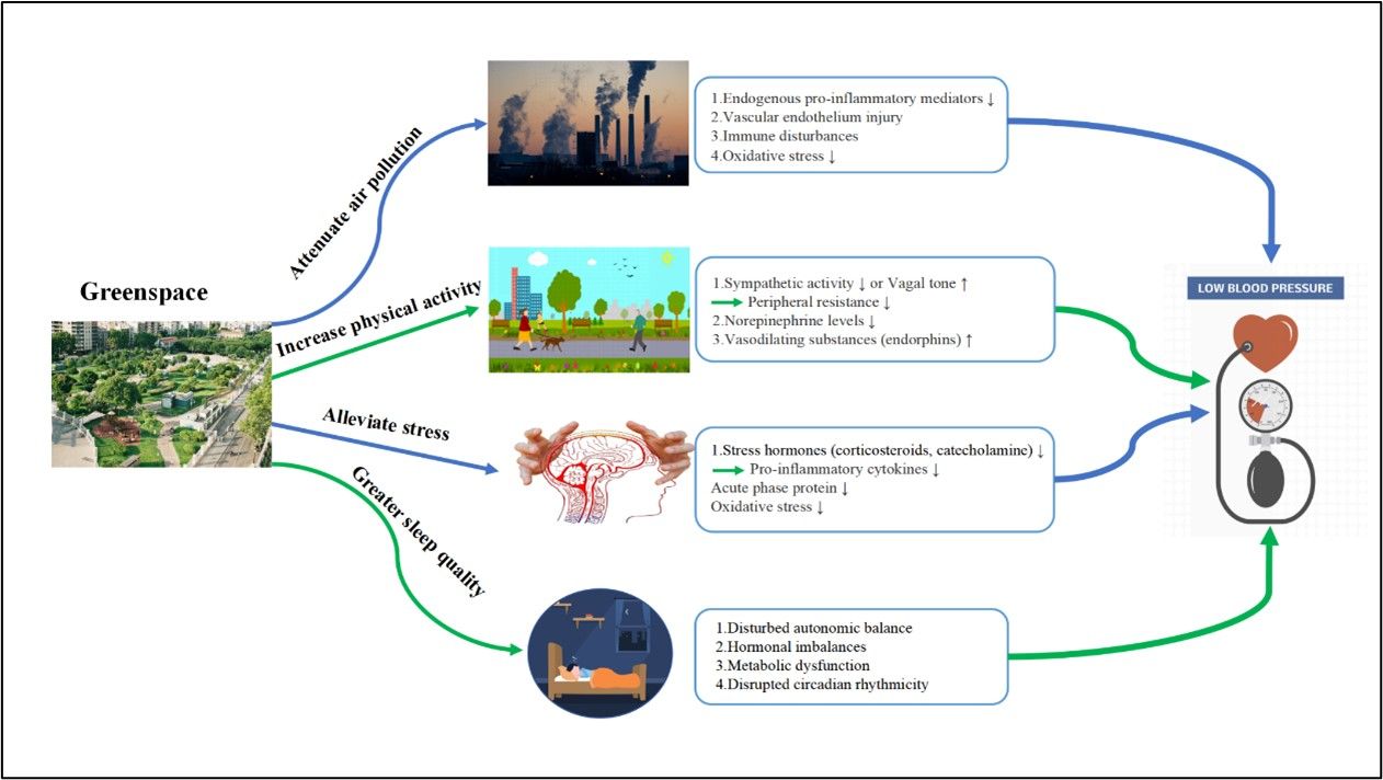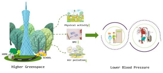 城市绿地具有最广泛的公共性。作为一种公共资源,城市绿地可以被不同社会阶层的人群平等地获取和使用,对于促进社会弱势群体的健康具有积极的影响。我们研究提示,提高家庭和校园的绿地水平对儿童青少年的心血管健康带来潜在益处,这为如何更科学全面的做好我国学龄儿童肥胖、高血压防控提供重要参考。相较于城市大环境,家庭与学校环境范围较小,更易于改变(如易于实现绿地水平的提高)。同时,提高绿地水平相较于针对个人的预防措施,具有更高的健康收益。
