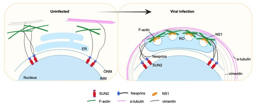黄病毒是单正链RNA病毒,只能编码十个病毒蛋白,必须募集与挟持宿主蛋白以完成其生命周期。鉴定和阐明参与病毒复制过程的宿主蛋白,可为抗病毒药物的筛选提供新的靶标。2024年1月5日,开云下注(中国)官网中山医学院张萍教授团队在Nature Communications在线发表了题为“Nuclear membrane protein SUN2 promotes replication of flaviviruses through modulating cytoskeleton reorganization mediated by NS1”的论文。该研究揭示:虽然黄病毒是在细胞质完成复制周期,却需要细胞核膜蛋白的参与。