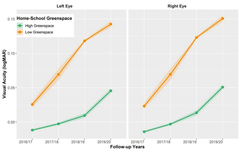 该研究发现,城市绿地与学龄儿童视力水平呈正相关,与视力受损风险呈负相关。具体而言,较高的城市绿地与较低的基线视力z分数(即较好的视力水平)和较慢的3年随访视力z分数下降(即儿童视力下降的速度越慢)有关;绿地面积越大,视力受损的风险越低,家庭、学校绿地暴露增加与视力损伤风险呈反向关系,以家庭-学校绿地综合指数每增加一个IQR与儿童视力受损风险降低7%存在显著关联。此外,男孩和家庭收入低和/或父母教育程度低的儿童可能会从周围绿地中获得更多对视力的有益影响。中介分析表明,体力活动和娱乐屏幕时间可以部分解释这些有益关联,而空气污染(PM10)和户外时间在这些关联中的作用相对较小。