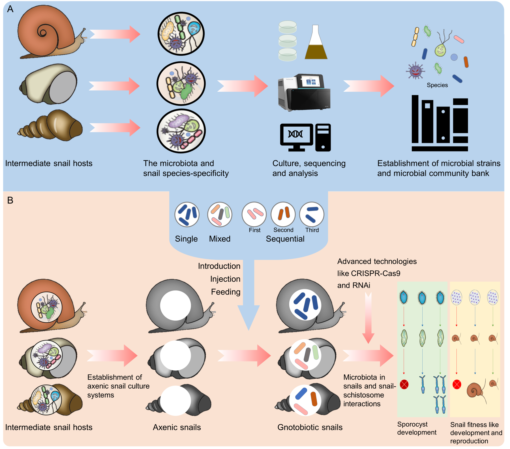 螺传寄生虫病仍是严重危害人类健康的寄生虫病之一。其中,血吸虫病是一种由钉螺、双脐螺或水泡螺等淡水螺传播的寄生虫病,据估算至今全球仍有超过2.3亿人口感染过血吸虫病,给全世界造成了重大疾病负担。目前,尽管血吸虫病在我国已经得到有效控制,但要实现“2030年消除目标”仍然迫切需要解决保虫宿主种类广泛及钉螺分布面积大等关键防治问题。同时,输入性血吸虫病的有效监控也是面临的另一个重要挑战。而从全球疫情来看,曼氏血吸虫和埃及血吸虫病流行仍然严重,也缺乏针对这些血吸虫病的有效疫苗。因此,除了吡喹酮化疗外,“灭螺”仍然是控制血吸虫病最有效的防治对策之一。目前,控制螺类的主要策略之一是使用化学杀螺剂,如氯硝柳胺等。然而,化学灭螺药物的生产和使用对环境和非靶标水生生物均产生严重污染和毒害作用,以“灭螺”为主的对策受到极大的限制,亟待研发环境友好型“灭螺”技术。我们的前期研究(Microbiome 2023)提示,螺类的适生与共生微生物群之间存在密切关系。因此,揭示和操纵螺类共生微生物群及与血吸虫之间的相互作用,并结合无菌和限菌技术研究,有助于开发出基于微生物的绿色高效环保的新型血吸虫病控制策略,为控制血吸虫病这类螺传疾病提供关键技术支撑。