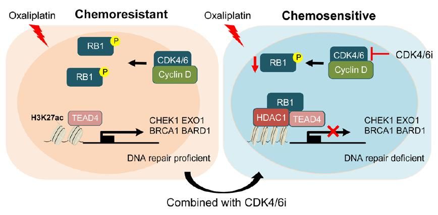最后,通过整合分析RNA-seq和ChIP-seq数据,CDK4/6抑制剂通过表观遗传修饰调控RB1-TEAD4信号轴影响同源重组修复相关基因的表达,从而逆转奥沙利铂耐药现象(图4)。