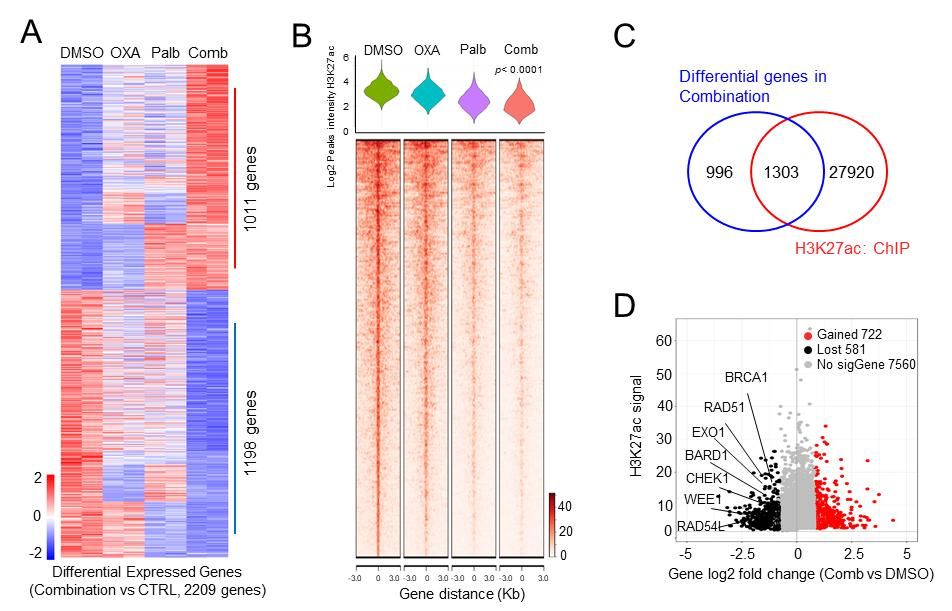新辅助化疗是目前临床上治疗局部晚期直肠癌的主要手段,但是约30%-60%的直肠癌患者对目前新辅助化疗方案不敏感,肿瘤退缩较小或者甚至不退缩,然而临床上又缺乏更多的药物治疗选择,这群患者的术后辅助治疗多是继续沿用一线的化疗方案,预后极差。为了探索肠癌新辅助化疗耐药的肿瘤分子特征,研究团队首先收集了结直肠癌肿瘤组织进行转录组测序,再跟踪随访病人化疗效果,根据疗效把病人分为化疗敏感型和耐药型,进行分组分析。结果发现耐药型肿瘤组织中细胞周期相关的信号异常活化,提示以“靶向异常的细胞周期检查点”寻找治疗靶点可能可以逆转化疗耐药。于是进一步利用小分子抑制剂文库进行高通量筛选,发现CDK4/6抑制剂可以有效提高奥沙利铂敏感性,并且可以协同抑制肿瘤细胞增殖。机制上,通过整合全转录组测序分析和染色质共沉淀测序分析发现CDK4/6抑制剂通过影响表观遗传修饰调控同源重组修复相关基因的表达,从而解释了CDK4/6抑制剂为何可以逆转奥沙利铂耐药现象的机制,该研究有望为新辅助化疗耐药的直肠癌患者提供新的用药选择(图1)。