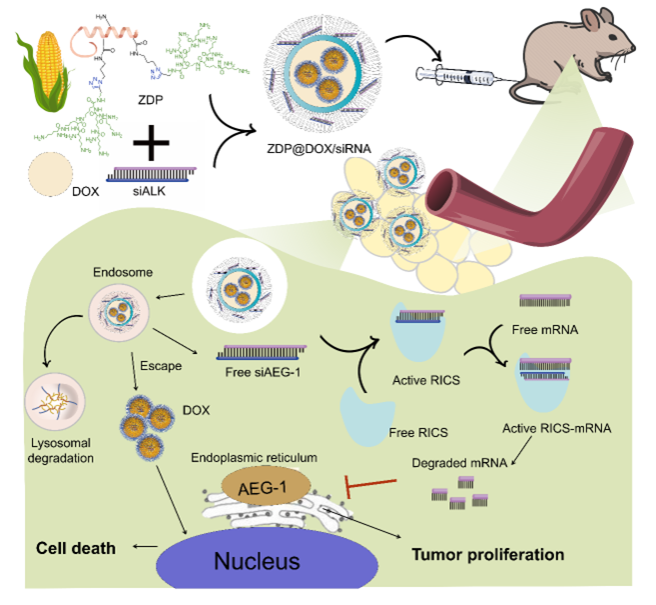 星形胶质细胞升高基因-1 (AEG-1) 癌基因是包括骨肉瘤在内的多种人类恶性肿瘤中一个臭名昭著且不断发展的靶点。RNA干扰 (RNAi) 已被临床证明可以有效地敲除特定基因。为了在体内成功实施RNAi,保护载体不仅需要保护不稳定的siRNAs不被降解,还需要将siRNAs以可控释放的方式传递到靶细胞。为此,课题组合成了树状聚赖氨酸功能化玉米蛋白 (ZDP) 非病毒模块化系统,该系统可以在骨肉瘤中实现siRNA靶向的AEG-1基因沉默和抗肿瘤药物的包封控释。ZDP 的合理设计结合了玉米蛋白的非离子型、低免疫原性和树状聚赖氨酸 (DPLL) 的正电荷,通过静电配合物包封siRNA和DOX有效载荷,在溶酶体酸性微环境中实现pH控制释放。纳米复合物的定向递送在143B细胞中极大地提高了siRNA的稳定性、摄取和AEG-1序列特异性敲除,其转染效率与商用脂质体相当,但具有更低的细胞毒性。这种以 AEG-1-focused RNAi 疗法配合化疗,抑制了143B细胞的增殖,诱导了143B细胞的凋亡,有效抑制了异种骨肉瘤小鼠模型的生长。联合治疗是一种替代或组合策略,可以在骨肉瘤患者中产生持久的抑制反应。